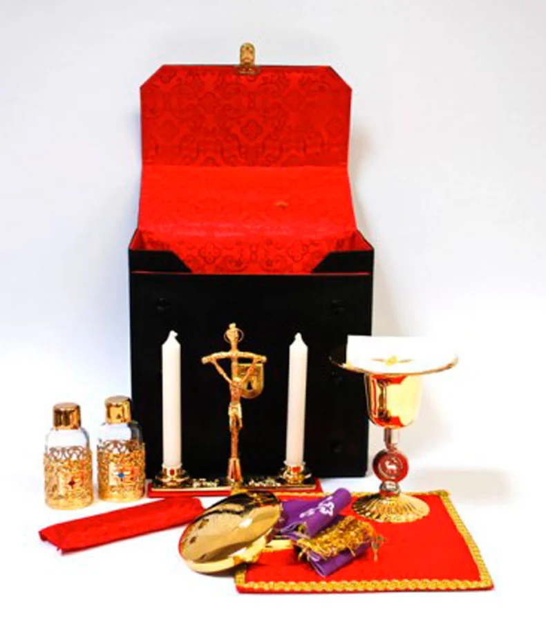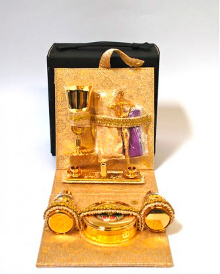 Eco-leather bag with strap, useful in handling. In a small space everything you need for the Celebration. The interiors are completely by satin jacquard lined Colors: Red, yellow/gold and white damask.