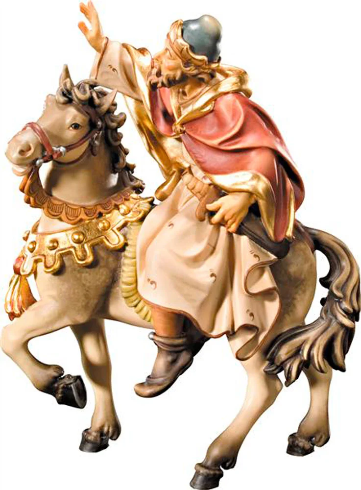 Caspar King on horse without base of high quality in noble woods. Normally in linden, maple or oak wood. Sculpture with a perfect finish.