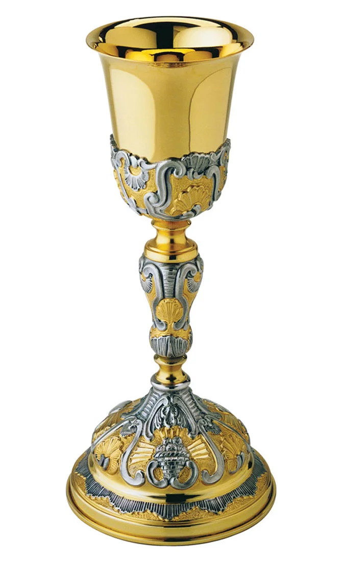 Beautiful baroque chalice in brass fusion of a quality and exceptional finishes, the cup is made in silver 800/1000. The base depicts the motifs of a basket of bread, the tablets of the law and the sacred heart.
