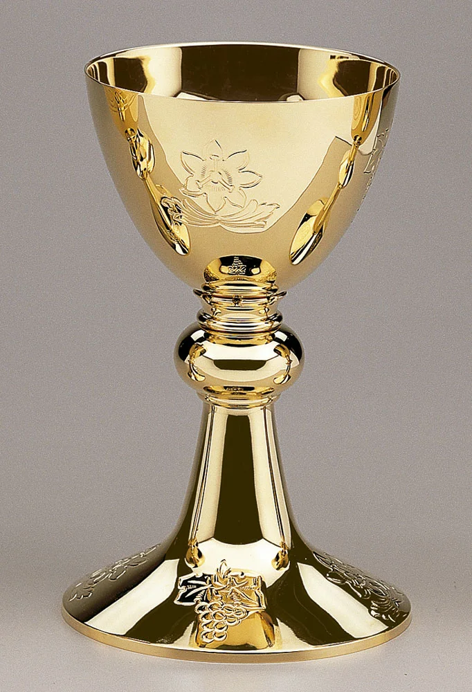 Precious Chalice chiselled beautifully ornamented, in brass fusion gold plated, of great quality and exceptional finish. It is possible to do it in sterling silver, contact us. It is possible to make it in sterling silver, please contact us.