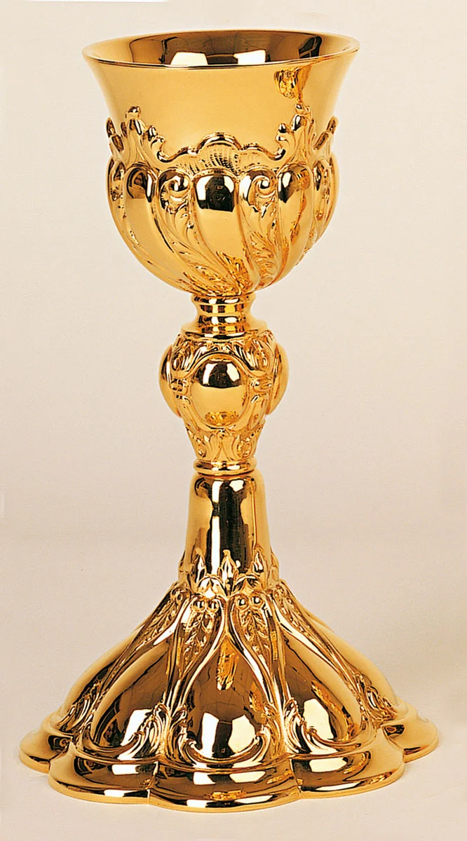 Beautiful chalice in Baroque style. It is possible to realize it in brass gold plated, brass with inner cup of 925 sterling silver, or to realize it 100% in 925 sterling silver.