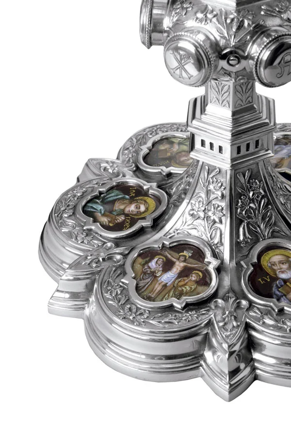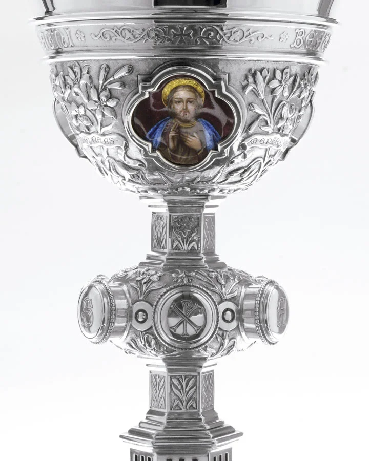 Chalice in Gothic style with motifs of the Evangelists, the crucifixion and the ascension, enamel to the fire. Available in two finishes. Paten of the same line (16 cm. Diameter) and case included.