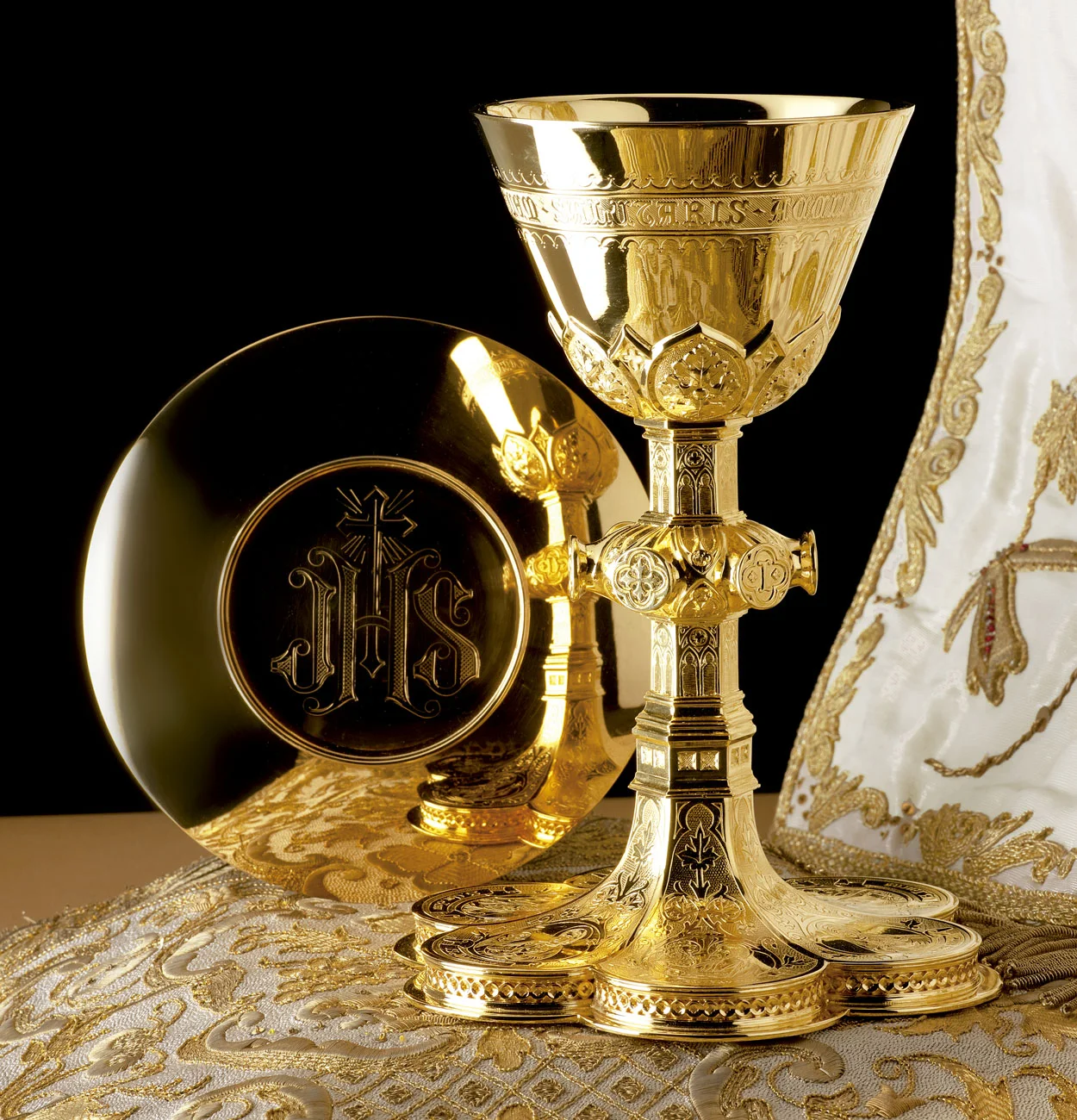 Chalice in gothic style. Available in two finishes. Paten of the same line (16 cm. Diameter) and case included.