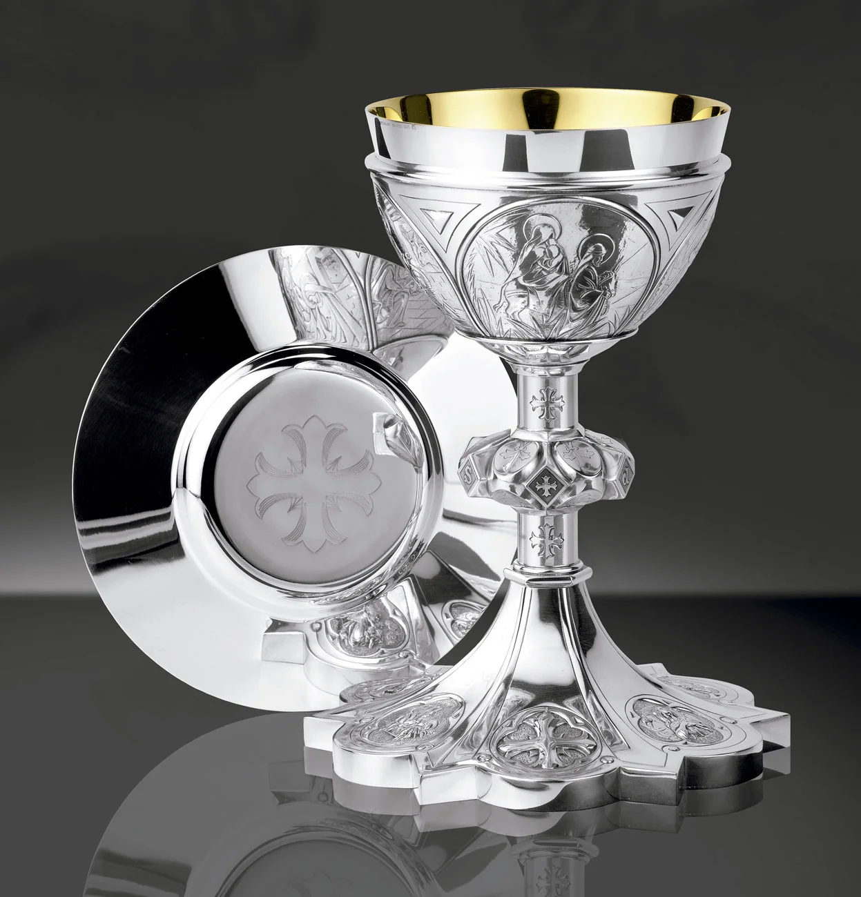 Chalice in gothic style, with the motif of several scenes of the life of Christ. Available in two finishes. Paten of the same line (16 cm. Diameter) and case included.