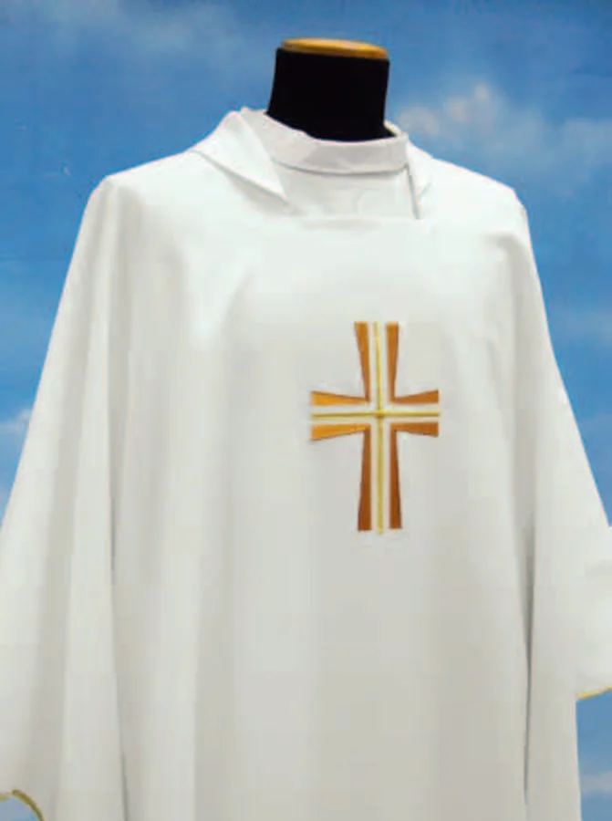 A simple white liturgical chasuble, made of 100% polyester, lightweight and easy to care for. Decorated with an embroidered cross on the front, gold trim, and a generous cut for a beautiful drape. Ideal for everyday wear and ordinary celebrations. Special opportunity due to stock clearance. Limited units.