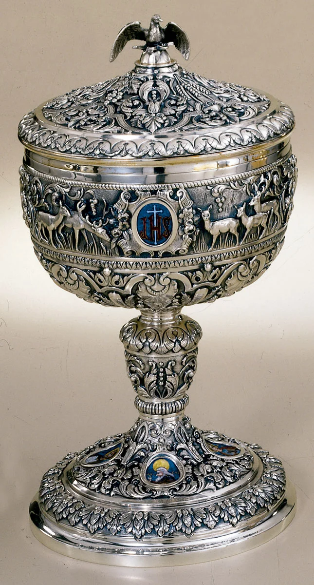 Spectacular ciborium with the motif of the Apostles and JHS, chiselled and with fire-enameled medallions. Capacity for 750 hosts.