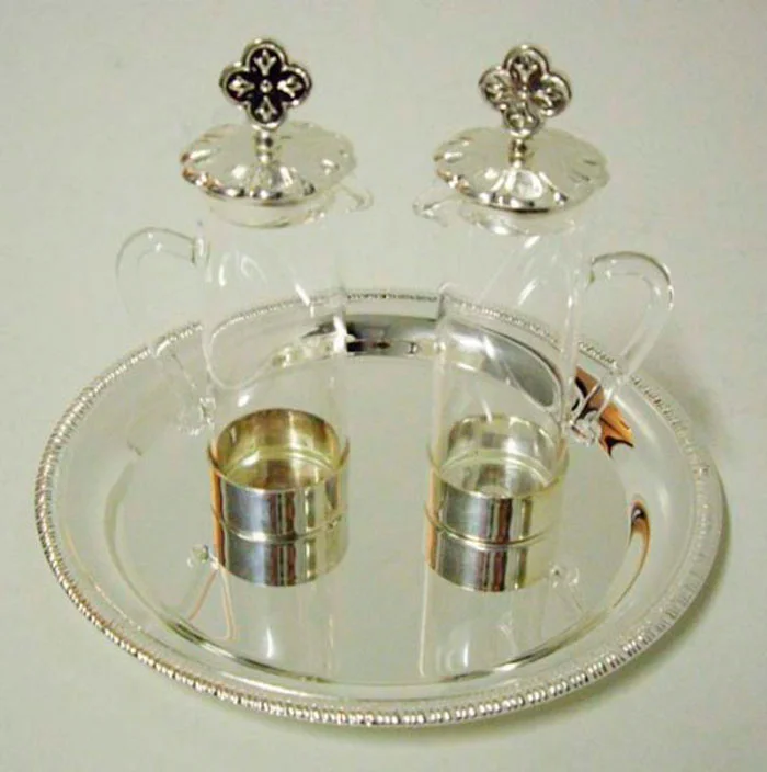 Cruet set with Parma ampoules, decorated with application of grape and wine l leaves, hand-made painted.