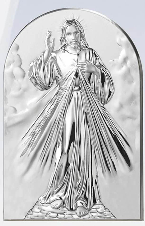 Spectacular altarpiece of Divine Mercy of great beauty and quality, made in laminated silver. Ready to hang and with desktop support