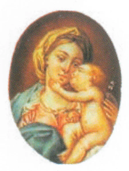 Handpainted medal with representation of the Madonna with child (Pompeo Batoni) in 18 carat Gold ans Sterling Silver 925 (watercolor), characterized by great attention to detail and exceptional qualit. The die cut mount includes rubies, sapphires and emeralds.