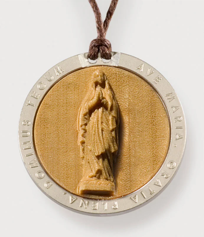 Medal with the representation of Our Lady of Lourdes, made in boxwood and 925 sterling silver, with cord.
