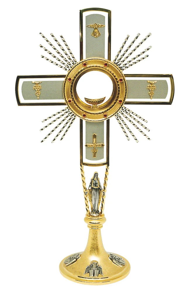 Monstrance (ostensorium) in fusion of brass with virging and dove.