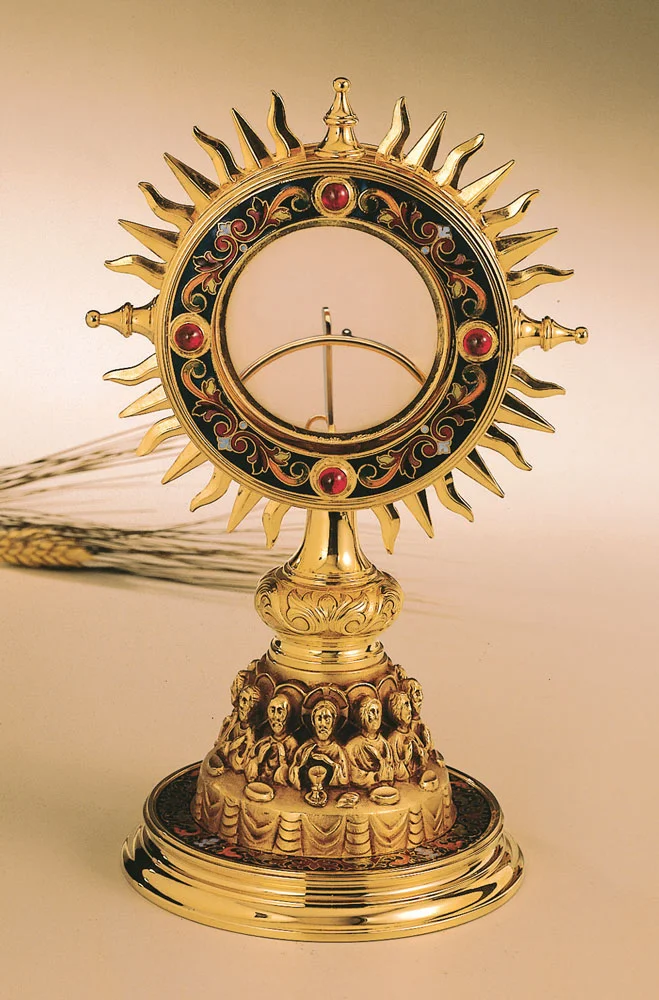 Monstrance in brass fusion with Last Supper motif.