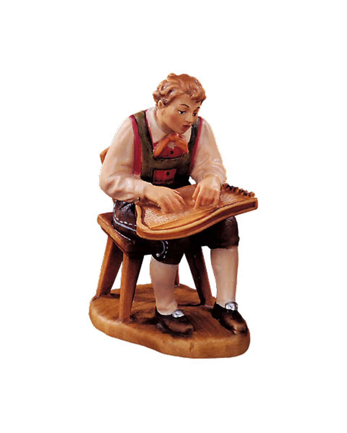 Carved wooden image. Musician with cithern in natural wood carving.