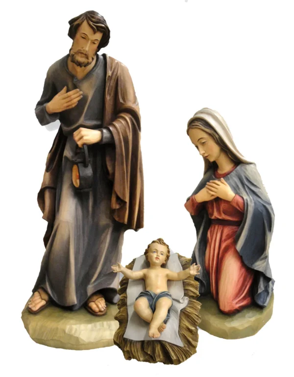 Nativity in fiberglass, made up of Saint Joseph, the Virgin Mary and the Child Jesus. Various finishes available. The Natural and Exterior Color decorations are suitable to put the sculpture outdoors.