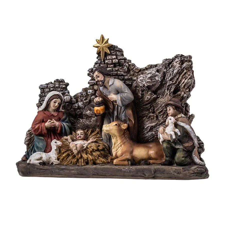 Beautiful sculpture of the nativity with shepherd and animals, made of decorated resin.