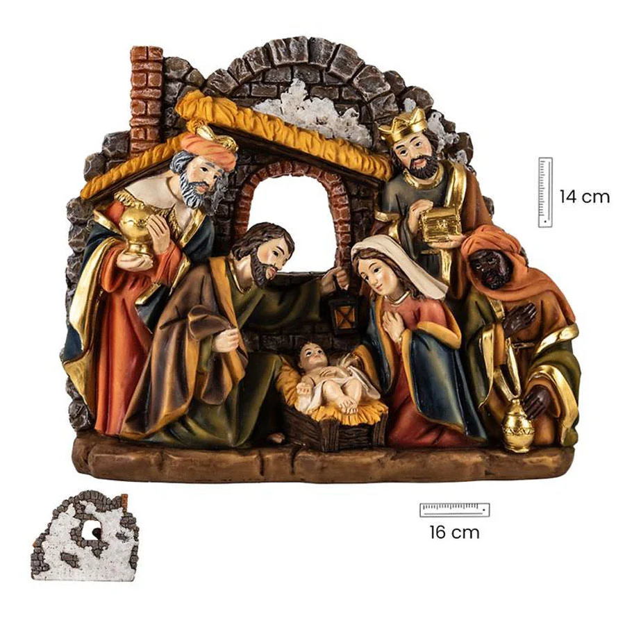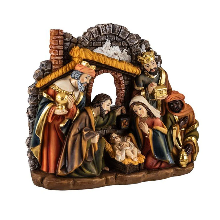 Beautiful sculpture of the nativity with three wise men and nativity scene, made of decorated resin.