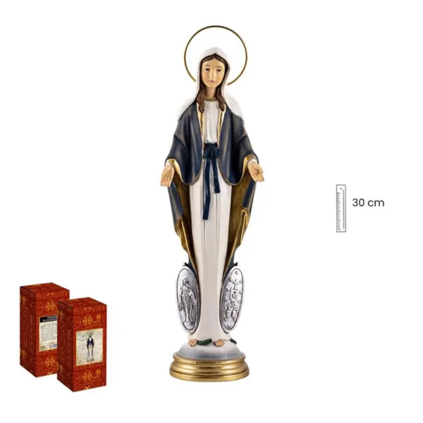 Devotional sculpture made of resin stands out for its careful craftsmanship.