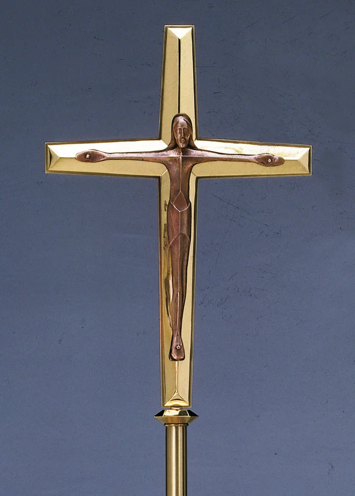 Processional Cross in brass fusion. Processional Cross in brass fusion. The size of the Cross is 60×40 cm (Height x Width), and a removable flagpole is included 150 cm. Base not included.