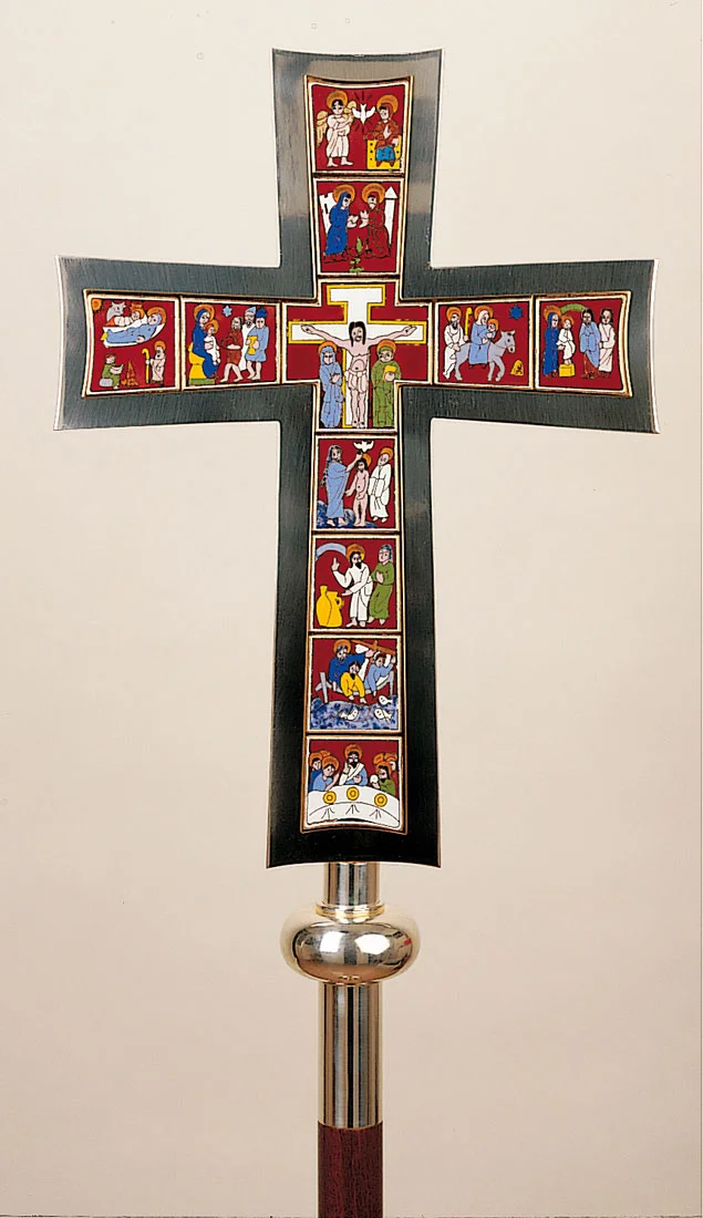 Processional Cross in brass fusion and enamels, silver plated.