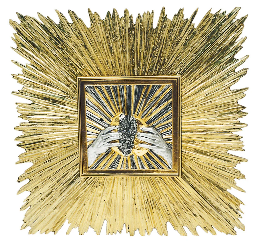 Brass-fused tabernacle for wall mounting, with bread motif. Security lock.