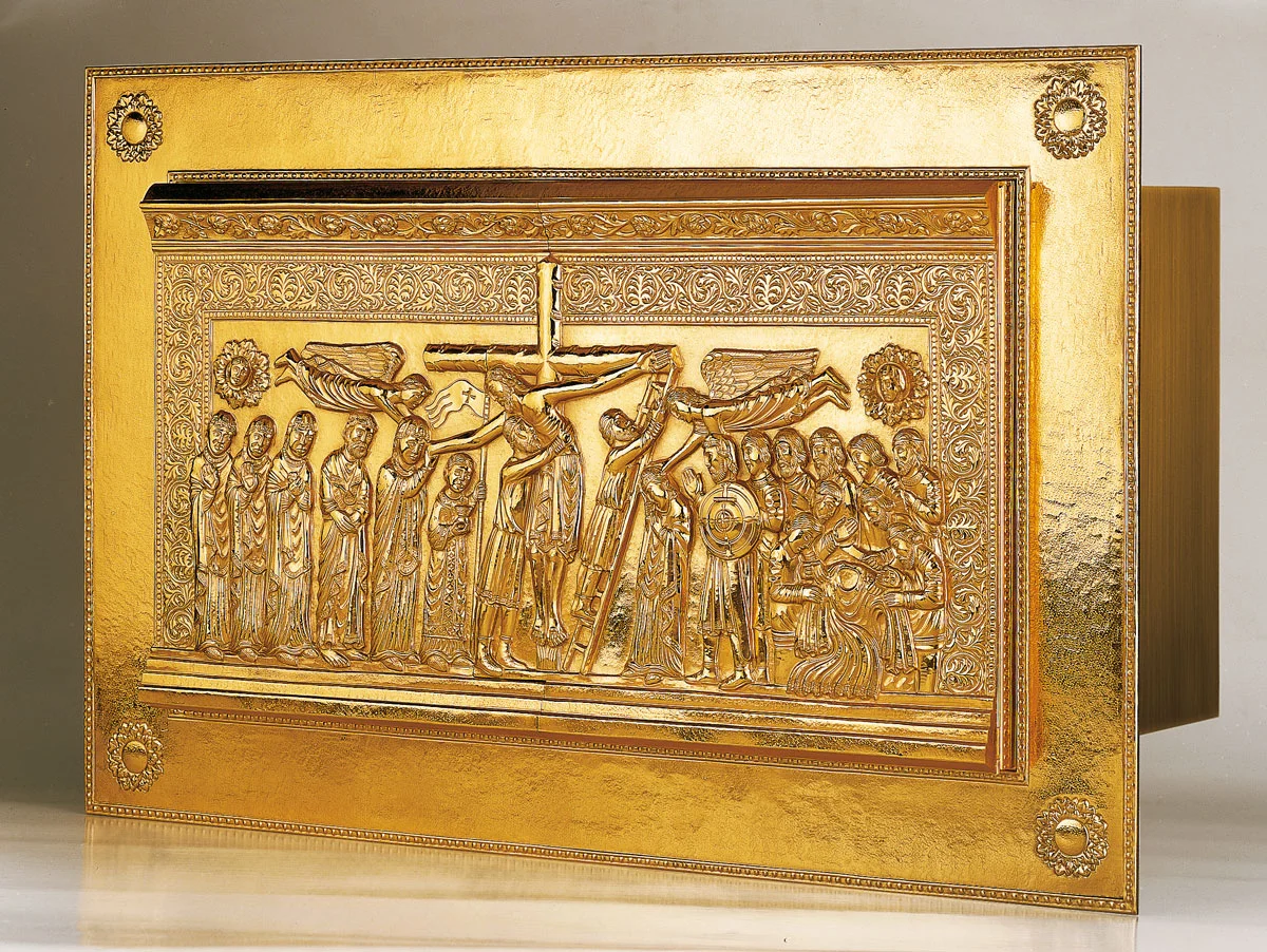 Brass-cast tabernacle for wall mounting, with Crucifixion motif. Security lock.