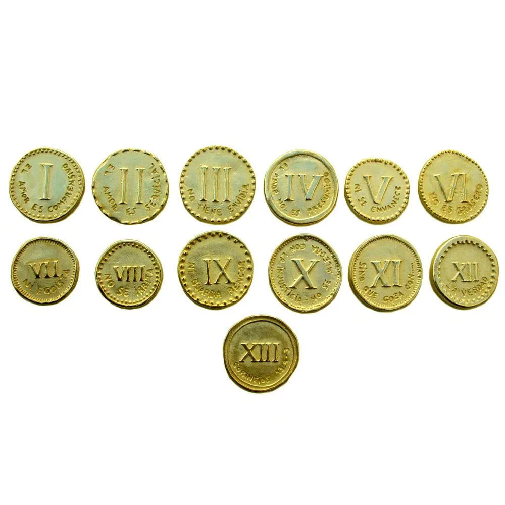 Wedding Coins. Thirteen coins with the passage from Corinthians 13, 4-7 inscribed on them, each one distributing a fragment of the biblical text: "Love is understanding, love is kind, it does not envy. Love is not conceited, nor is it conceited, it is not rude nor selfish, it is not easily angered nor keeps a grudge. It does not rejoice in injustice, but rejoices with the truth."