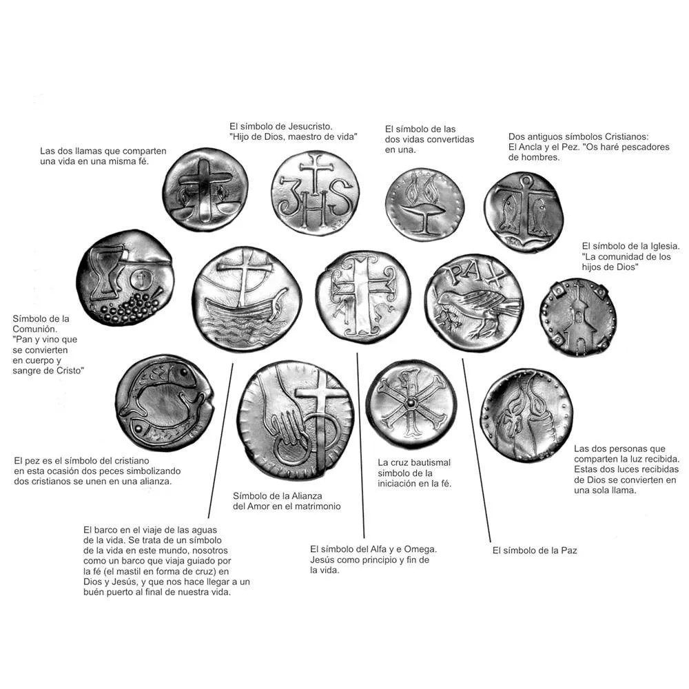 Elegant wedding coins featuring Paleo-Christian motifs. Thirteen pieces of varied sizes and designs, adorned with emblems of the early Christians, representing fundamental values to be shared by the couple during their marital union, with a textured surface that evokes ancient sand-casting methods.