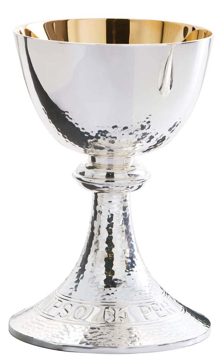 Cáliz cincelado en fusión de latón con baño de plata con motivos romanicos.