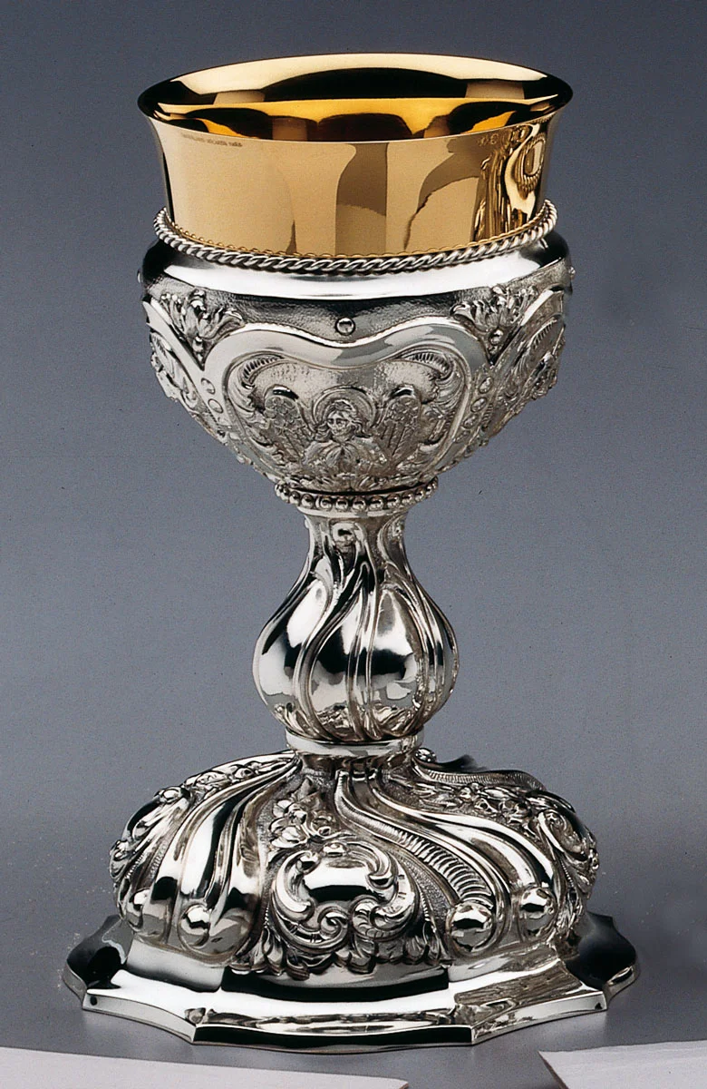 Cáliz de estilo barroco, bellamente ornamentado. Disponible en dos acabados. Patena de misma línea (14,5 cm. Diámetro).