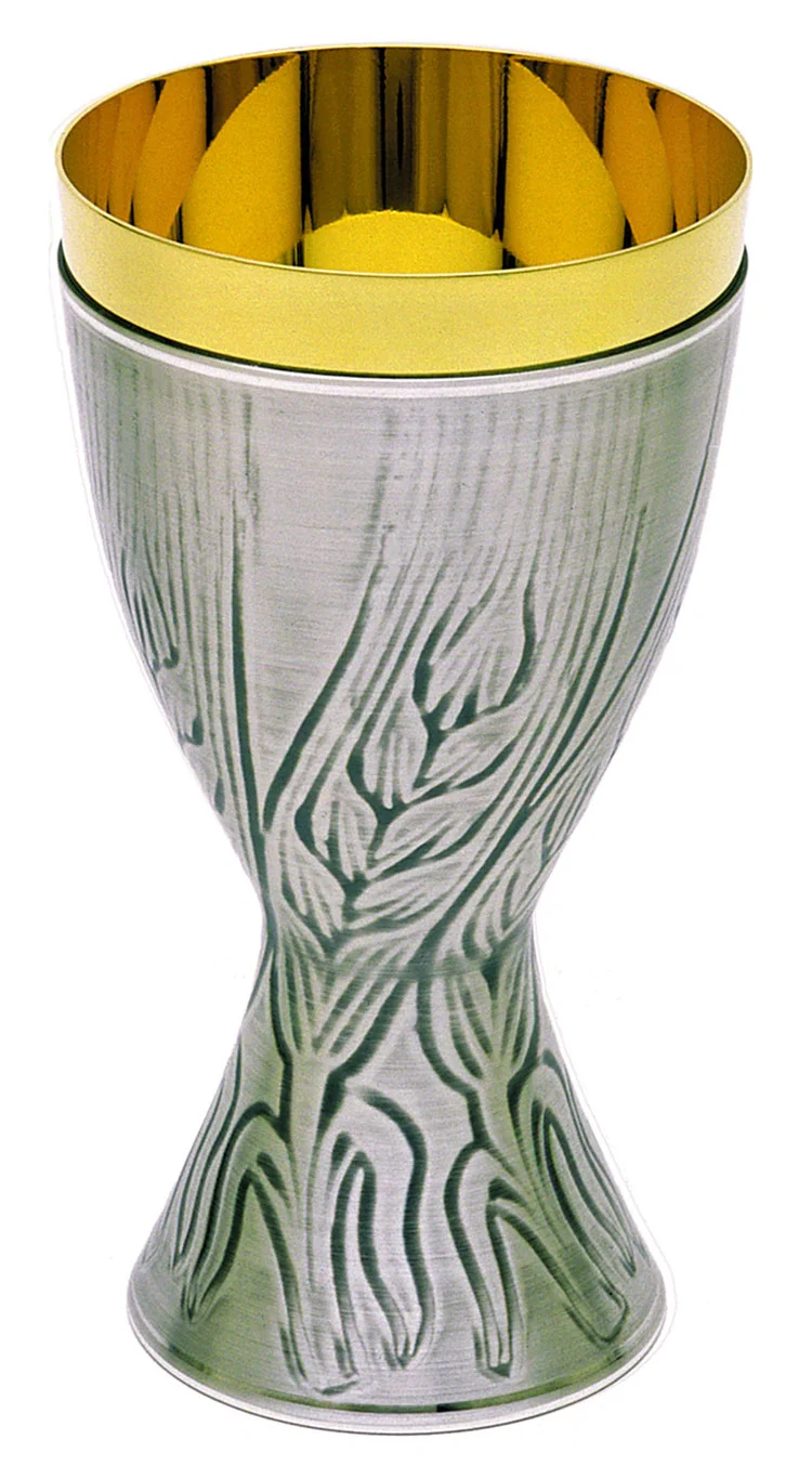 Cáliz de metal grabado. Disponible en acabado dorado o plateado.