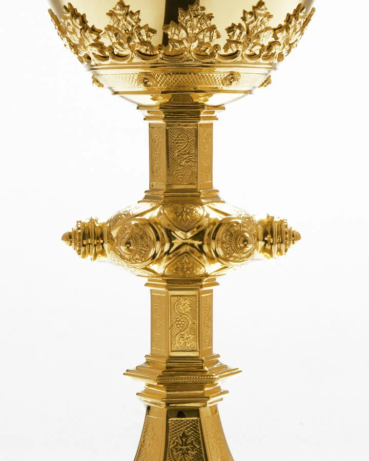Espectacular cáliz de estilo gótico, trabajado artesanalmente. Es posible realizarlo en latón con copa interior de plata 925, o cáliz realizado 100 % en plata de ley.