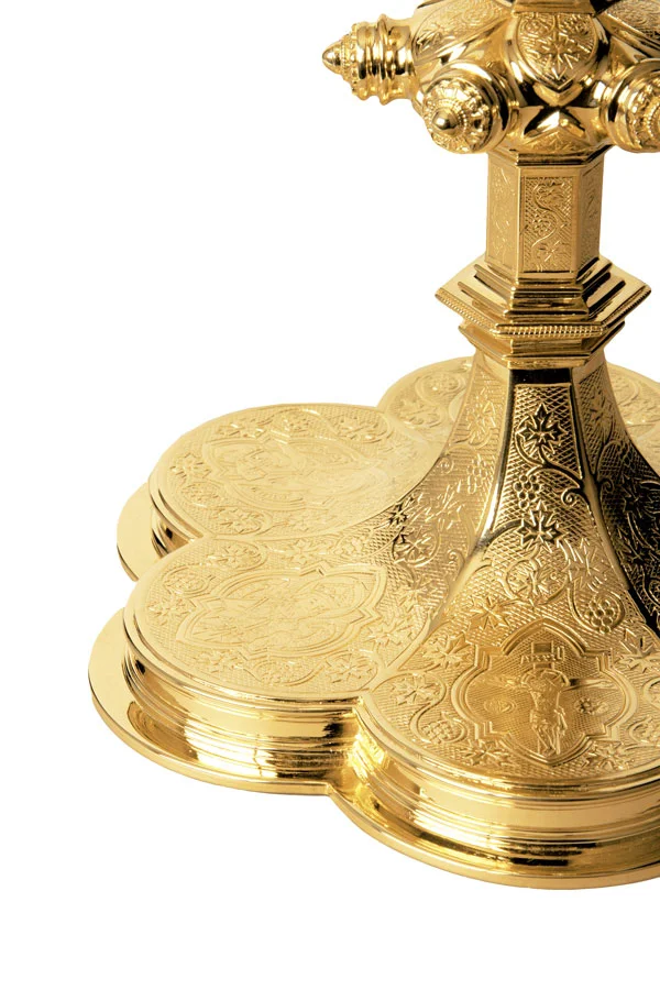 Cáliz de estilo gótico. Disponible en dos acabados. Patena de misma línea (16 cm. Diámetro) y estuche incluido.