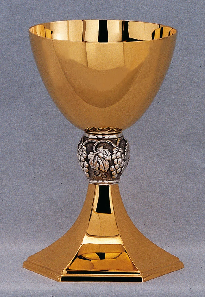 Precioso cáliz de estilo clásico, fabricado de forma artesanal y de una calidad excepcional. Es posible realizarlo en latón con baño de oro, o latón con copa interior de plata 925.