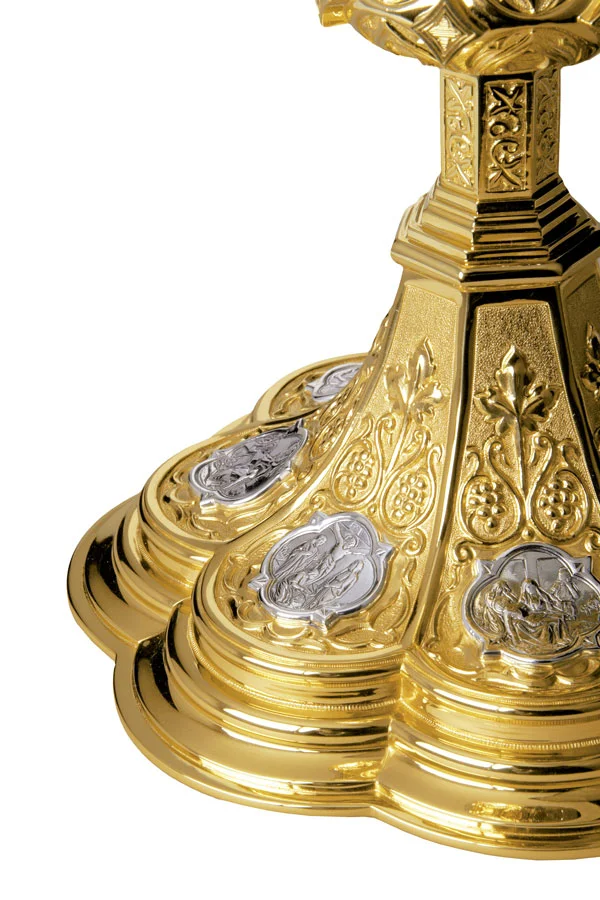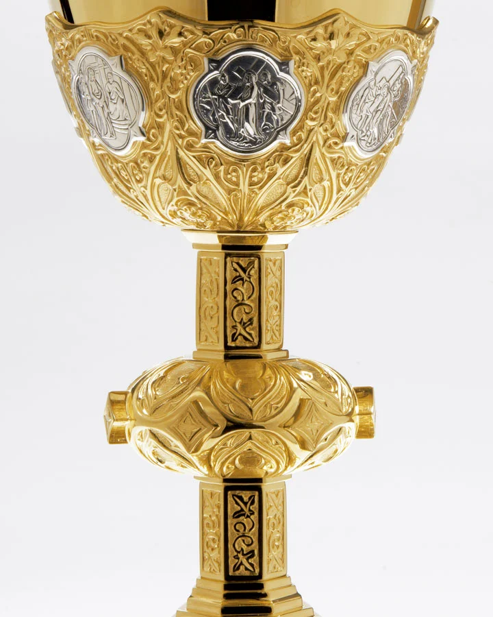 Cáliz de estilo gótico con motivos del Vía Crucis. Disponible en dos acabados. Patena de misma línea (16 cm. Diámetro) y estuche incluido.