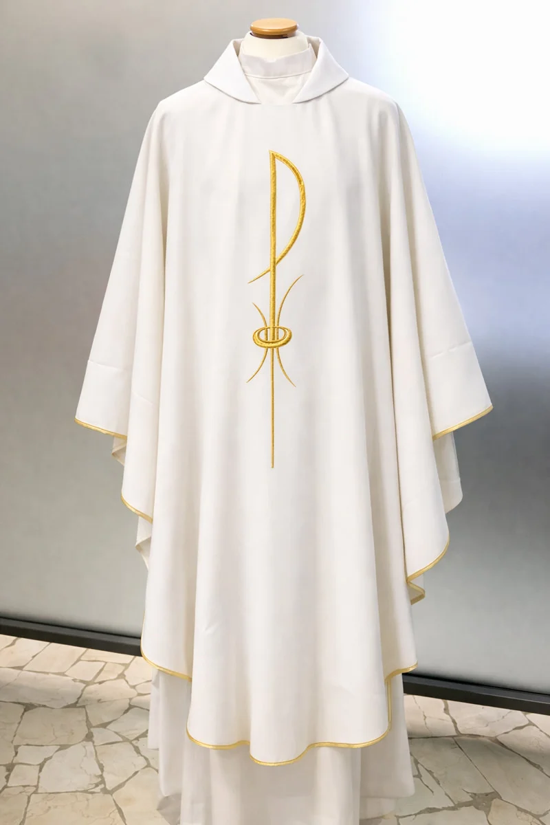 Disponible exclusivamente en color blanco, es apropiada para solemnidades, fiestas del Señor, celebraciones sacramentales y tiempo pascual.