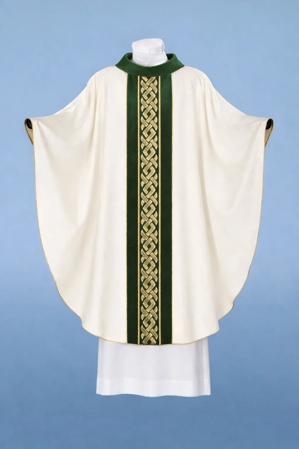 Esta casulla litúrgica verde presenta un diseño sobrio y armonioso, con una ornamentación cuidada que aporta riqueza visual sin perder equilibrio, pensada especialmente para el uso habitual en las celebraciones del Tiempo Ordinario.