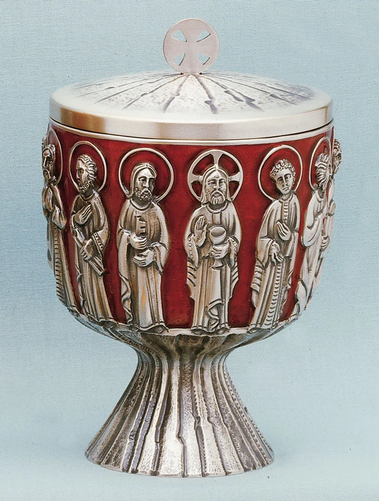 Copón cincelado, bellamente ornamentado con el motivo de los Apóstoles. Disponible en dos acabados.