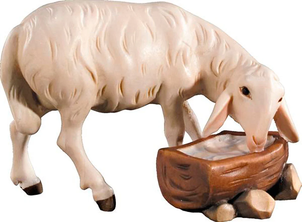Cordero bebiendo en talla de madera natural.