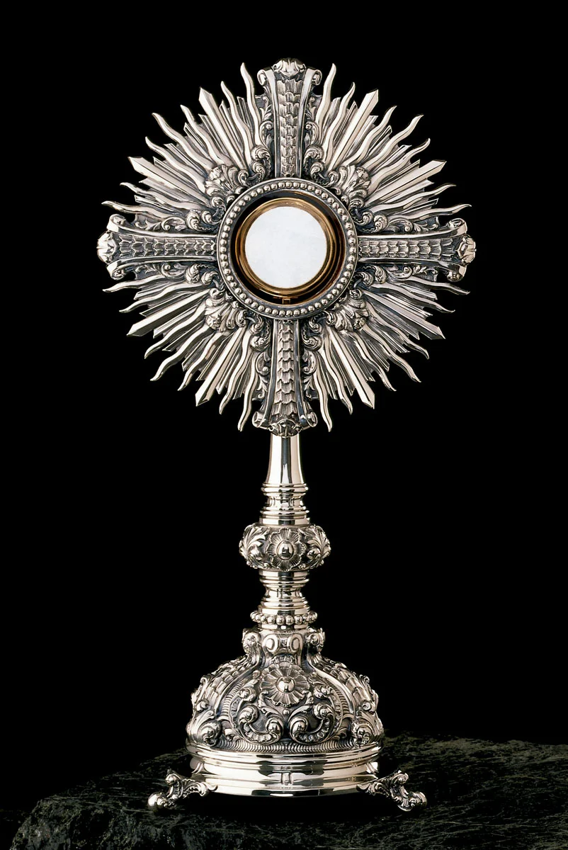 Espectacular ostensorio eucarístico en fusión de latón con forma de cruz central de una calidad y acabados excepcionales.
