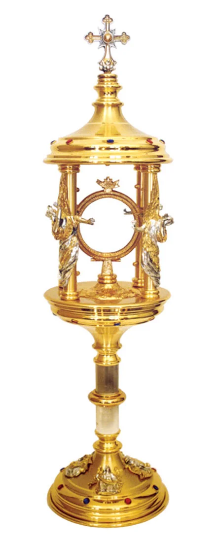Custodia (ostensorio) en fusión de latón con angeles y evangelistas.