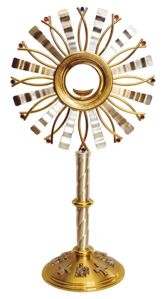 Espectacular ostensorio eucarístico fusión de latón de una calidad y acabados excepcionales. El diámetro interior del viril es de 9,5 cm.