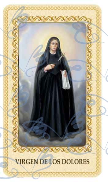 Elegante estampa de la Virgen de los Dolores plastificada con oración. Texto en español. Otros idiomas por encargo, consultar.