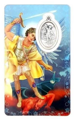 Elegante Estampa de San Miguel Arcángel con medalla, plastificada con oración. Texto en español. Otros idiomas por encargo, consultar.