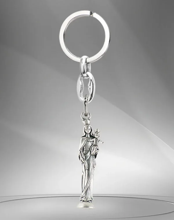 Llavero religioso en metal plateado de la Virgen Maria Auxiliadora.