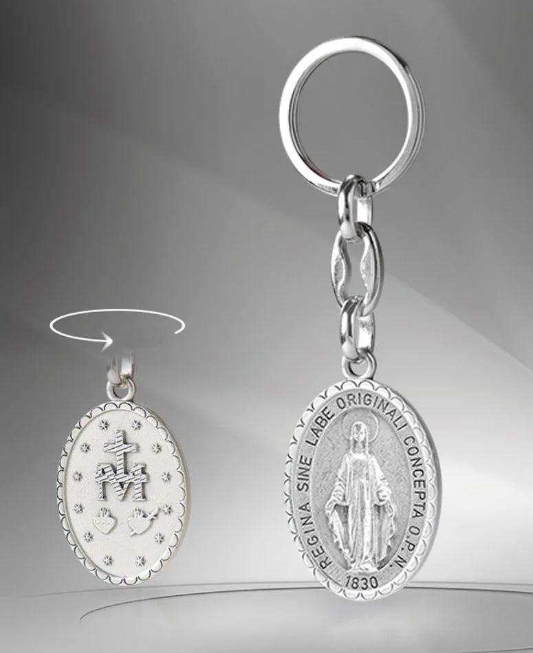 Llavero de la Virgen Milagrosa, realizado en metal.
