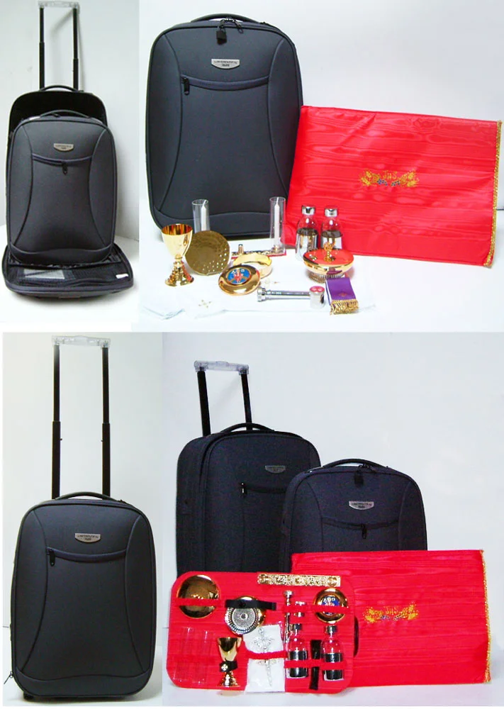 Doble Trolley 58 y 50 cms. Tela impermeable. Con ruedas, facil en su manejo. En un pequeño espacio todo lo necesario para la Celebración. El interior está forrado en satén jacquard rojo.