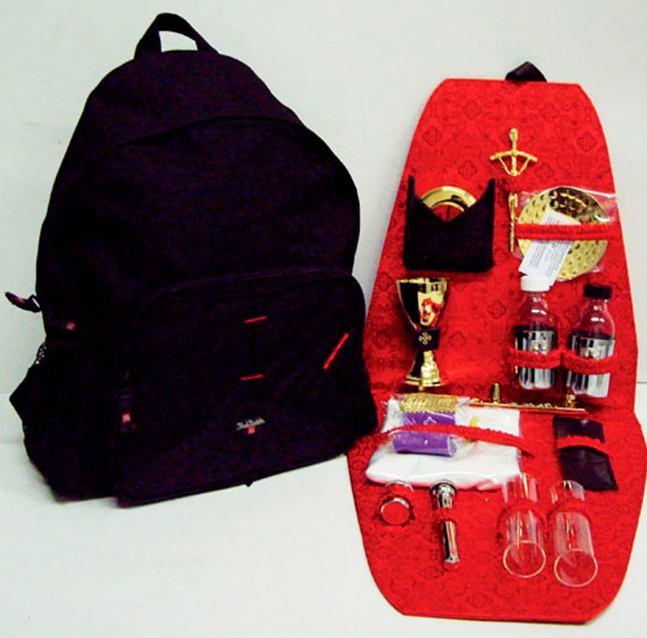 Pequeño Bolso con correa, impermeable. Fácil en su manejo. En un pequeño espacio todo lo necesario para la Celebración. El interior está forrado en satén jacquard rojo.