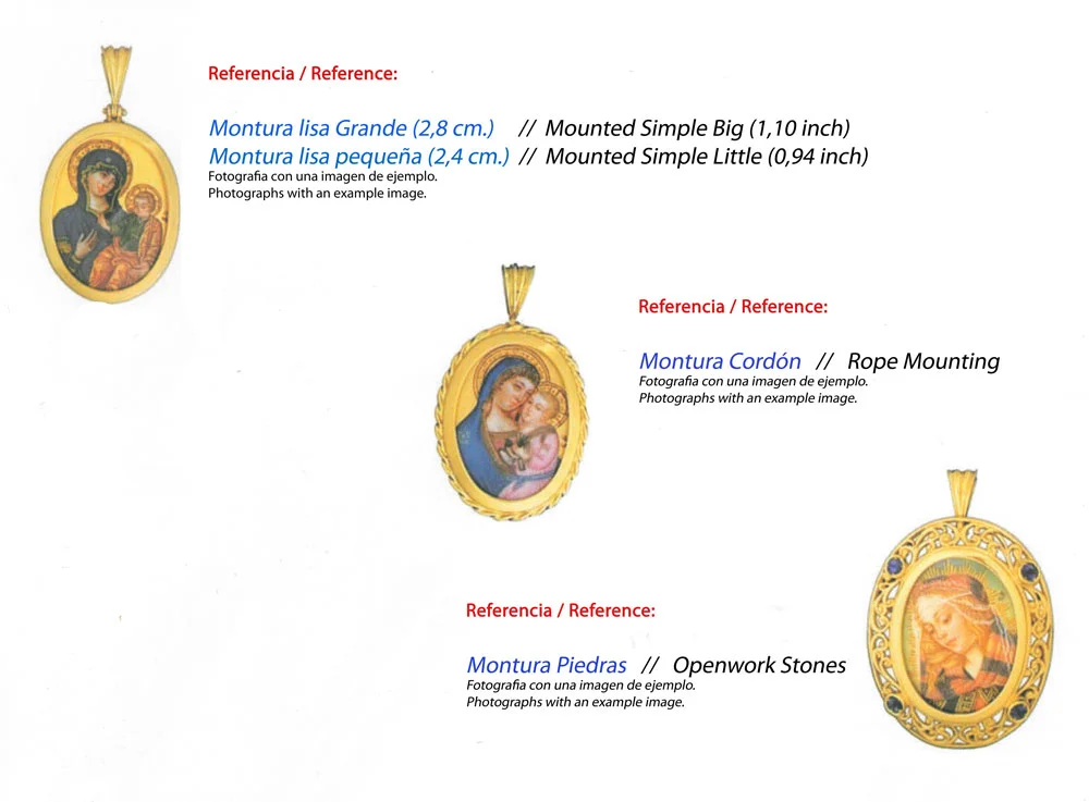 Medalla con representación de Santa Rita (Simone Martini) en oro de 18 quilates o plata de ley pintada a mano (acuarela), caracterizada por una gran atención a todos los detalles y de excepcional calidad. La montura troquelada incluye rubíes, zafiros y esmeraldas.