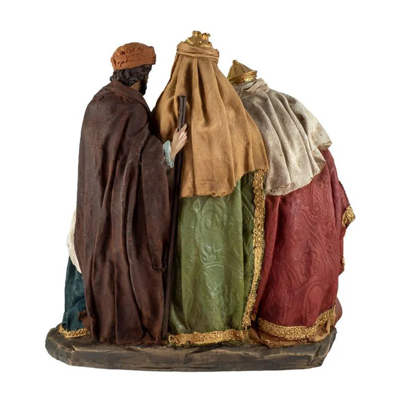 Preciosa escultura del Misterio con Reyes Magos, realizada en resina decorada.