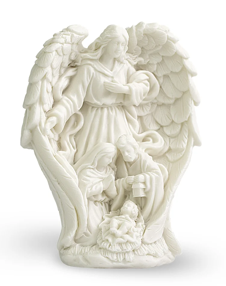 Preciosa escultura de la Natividad con Angel protector, realizado en resina blanca.